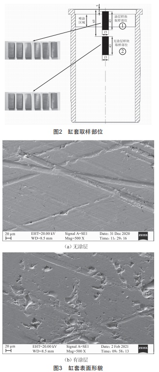 試驗采用DLC涂層鑄鐵氣缸套,涂層為DLC,分別在有無涂層區(qū)域取6份15 mmX43 mm的樣塊,取樣部位示意圖如圖2所示。缸套表面原始形貌如圖3(a)(b)所示,由圖可以看出有涂層的樣塊表面有許多凹坑,這是涂層的噴涂孔隙,有利于存儲潤滑油。