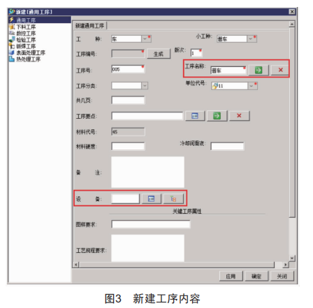 基于工藝BOP中的工序節(jié)點,可填寫具體的工序內(nèi)容(圖3),并能從分類庫中針對工藝結(jié)構(gòu)的工藝或工序指派資源,且可在系統(tǒng)中確定分配物料和資源的類型。
