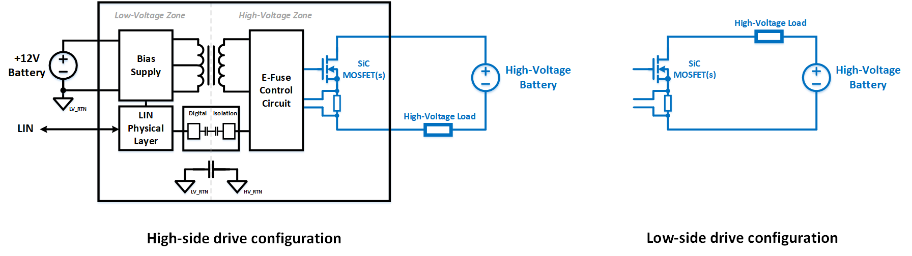 除了類似熔絲的行為外,電子熔絲還可以承擔機電繼電器的功能。如同繼電器線圈及其高壓觸點彼此電氣隔離一樣,高壓電子熔絲的控制信號與高壓端子之間也有隔離屏障。電子熔絲擁有類似于繼電器的靈活性,可以連接到系統(tǒng)中,作為為負載饋送高壓電池正極的高側(cè)輸出,或者作為為負載到高壓電池負極提供返回路徑的低側(cè)輸出,如圖3所示。