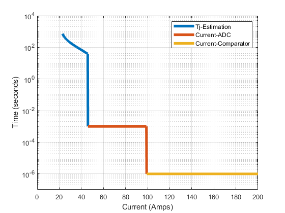 如圖2的時間-電流特性(TCC)曲線所示,電子熔絲包括三種過電流檢測方法,涵蓋從略微過電流到極高短路電流。TCC曲線定義了電子熔絲類似熔絲的行為,對低過電流的響應(yīng)速度慢,對高過電流的響應(yīng)速度快。
