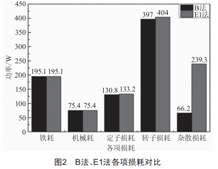 由于A法測量時各項損耗測量不全,故對B法、E1法的各項損耗進行比對,同樣以YE4-160M-4樣機為例,各項損耗比對如圖2所示。