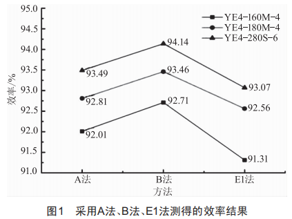 1)3種效率確定方法中,A法、B法檢測測試的參數(shù)較全,且對同一型號電動機,B法效率最高,A法次之,E1法測得的效率最低,不同的測試方法效率結果存在差異。