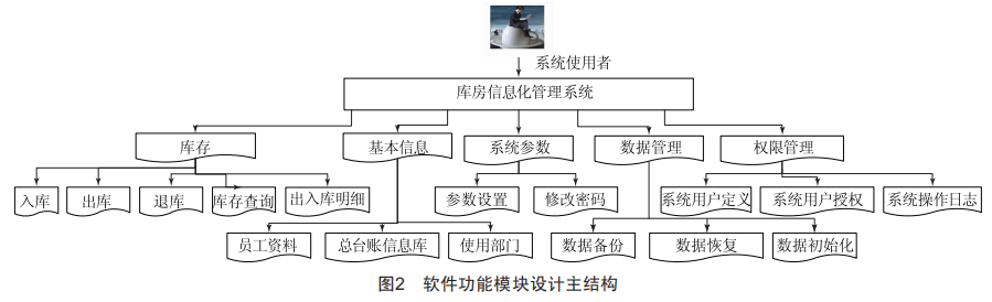 軟件結(jié)構(gòu)采用模塊化結(jié)構(gòu)進(jìn)行設(shè)計(jì),主要由5個(gè)主功能模塊組成,分別為庫(kù)存、基本信息、系統(tǒng)參數(shù)、數(shù)據(jù)管理、權(quán)限管理。在5個(gè)功能模塊基礎(chǔ)上再分成16個(gè)子功能模塊,子功能模塊再進(jìn)行功能分化,形成金字塔結(jié)構(gòu)。軟件功能模塊設(shè)計(jì)主要結(jié)構(gòu)如圖2所示。