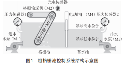污水處理粗格柵池控制系統(tǒng)由進水水泵、粗格柵、格柵輸送機、電動閘門、排水水泵等組成,系統(tǒng)可以實現(xiàn)過濾污水中的懸浮雜物,并將過濾后的水送入后續(xù)污水處理凈化池的自動控制系統(tǒng)中。系統(tǒng)結(jié)構(gòu)示意圖如圖1所示。