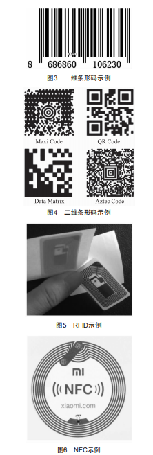 被動(dòng)標(biāo)識(shí)載體技術(shù)包括但不局限于一維條形碼、二維條形碼、RFID、NFC等,示例如圖3~圖6所示。
