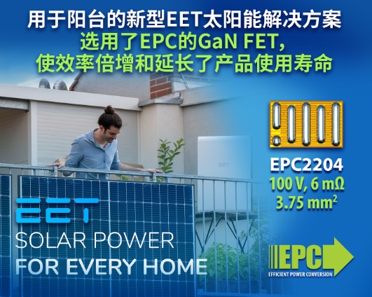 Efficient Energy Technology GmbH(EET)位于奧地利,是設計和生產(chǎn)創(chuàng)新、用于陽臺的小型發(fā)電廠的先驅。EET公司選用了宜普電源轉換公司(EPC)的增強型氮化鎵(eGaN®)功率晶體管(EPC2204), 用于其新型SolMate®綠色太陽能陽臺產(chǎn)品。EPC2204在低RDS(on)和低COSS之間實現(xiàn)了最佳折衷,這對于要求嚴格的硬開關應用至關重要,同時在緊湊的封裝中實現(xiàn)100 V的漏-源擊穿電壓。這種緊湊型設計顯著縮小了PCB的尺寸,保持較小的電流環(huán)路和最大限度地減少EMI。