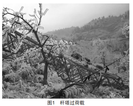 覆冰過荷載是導(dǎo)致輸電線路故障的主要因素之一,主要包括自重荷載、風(fēng)荷載和附著力荷載三種類型。當(dāng)輸電線路覆冰積累到一定體積和重量之后,輸電線路導(dǎo)、地線垂直方向的荷載將會(huì)倍增,使得弧垂增大,導(dǎo)線對(duì)地間距減小,從而有可能發(fā)生閃絡(luò)事故?;〈乖龃蟮耐瑫r(shí),在風(fēng)的作用下,兩根導(dǎo)線或?qū)Ь€與地之間可能相碰,會(huì)造成短路跳閘,燒傷甚至燒斷導(dǎo)線的事故。如果覆冰的重量進(jìn)一步增大,則可能超過導(dǎo)線、金具、絕緣子及桿塔的機(jī)械強(qiáng)度,使導(dǎo)線從壓接管內(nèi)抽出,或外層鋁股全斷、鋼芯抽出;當(dāng)導(dǎo)線覆冰超過桿塔額定荷載一定限度時(shí),可能導(dǎo)致桿塔基礎(chǔ)下沉、傾斜或爆裂,桿塔折斷甚至倒塌。嚴(yán)重覆冰會(huì)造成導(dǎo)線、地線斷裂,桿塔倒塌,金具損壞。其中桿塔過荷載示例如圖1所示。