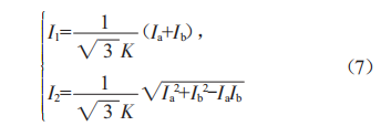 V/V接線牽引變供電臂負(fù)荷電流和系統(tǒng)側(cè)正序電流I1、負(fù)序電流I2的關(guān)系如下式所示: