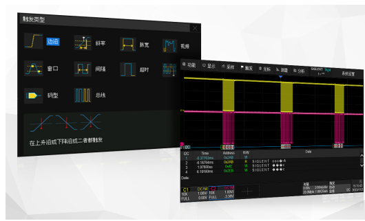 不僅在硬件性能上表現(xiàn)卓越,SDS800X HD還具有完備的軟件功能以適應(yīng)更多測(cè)量場(chǎng)合。SDS800X HD具有豐富的觸發(fā)功能,包括邊沿、斜率、延遲、建立/保持時(shí)間和多種總線觸發(fā)(串行觸發(fā))。支持嵌入式行業(yè)的I2C、SPI、UART協(xié)議及汽車(chē)行業(yè)的CAN、LIN協(xié)議的觸發(fā)與解碼,能夠準(zhǔn)確捕獲并直觀地將總線的協(xié)議信息以表格形式或其它方式顯示,穩(wěn)定進(jìn)行測(cè)試。