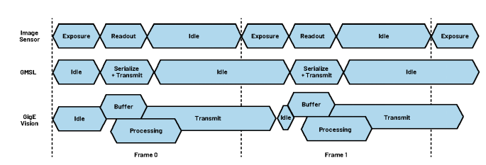 GigE Vision的模型更為復雜。盡管在許多情況下其可用鏈路速率比GMSL慢,但它可以利用額外的緩沖和壓縮來支持更高分辨率和/或更高幀速率。然而,這一切的代價是延遲和功耗的增加,并且相機系統(tǒng)兩側需要使用昂貴的元件。在一些不太常見的用例中,此類相機也以較低幀速率傳輸原始圖像數(shù)據(jù)。