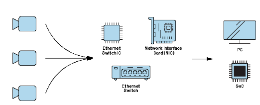 當僅使用一個相機時,GigE Vision在系統(tǒng)復雜性方面可能比GMSL有一些優(yōu)勢,因為它可以直接連接到具有以太網端口的PC或嵌入式平臺。然而,當使用多個GigE相機時,就需要以太網交換機。它可以是專用以太網交換機設備、具有多個以太網端口的網絡接口卡(NIC)或多個以太網端口與SoC之間的以太網交換IC。在某些情況下,這將導致最大總數(shù)據(jù)速率降低,更糟糕的是,這將帶來不可預測的延遲,具體情況取決于相機和終端設備之間的接口。參見圖3。