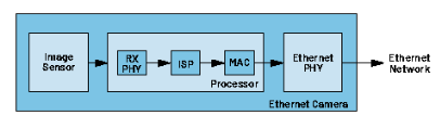 GigE Vision相機的信號鏈(如圖1所示)通常由三個主要元件組成:圖像傳感器、處理器和以太網PHY。處理器將圖像傳感器中的原始圖像數(shù)據(jù)轉換為以太網幀,該過程通常涉及圖像處理和壓縮或幀緩沖,以使數(shù)據(jù)速率適合以太網支持的帶寬。