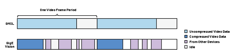 這兩種技術都以突發(fā)方式傳輸數(shù)據(jù)。因此,較長期間(一個視頻幀或更長時間)內的平均數(shù)據(jù)速率甚至可能低于傳輸期間的有效視頻數(shù)據(jù)速率。對于GMSL相機,突發(fā)時間僅取決于圖像傳感器的讀出時間,實際應用中的突發(fā)比可能達到100%以支持完整的有效視頻數(shù)據(jù)速率。GigE Vision相機可能用在更復雜和不可預測的網絡環(huán)境中,在這種情況下,為了避免數(shù)據(jù)沖突,突發(fā)比通常較低。示例參見圖7。