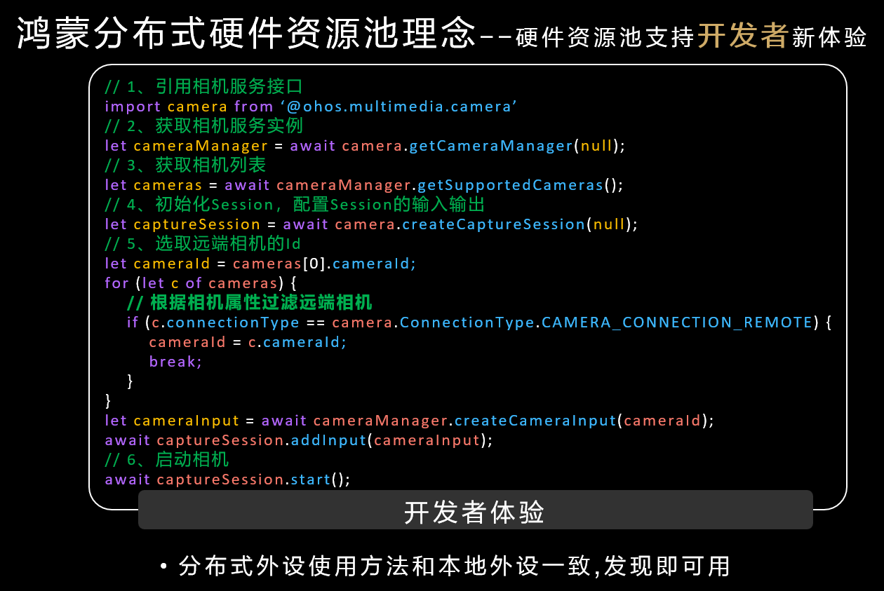 對于開發(fā)者來說,因為分布式硬件資源池將跨設備硬件調(diào)用的復雜度都封裝在了系統(tǒng)底層,跨設備硬件可復用本地硬件的API,因此開發(fā)者學習和適配難度可以做到最低。