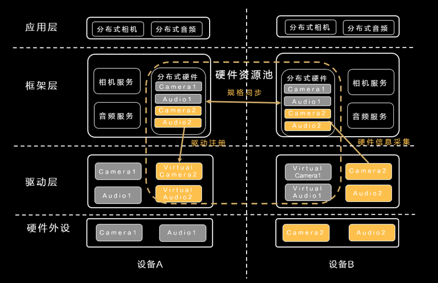 假設設備A和設備B都有各自的相機和音頻外設,驅動層有對應的本地相機和本地音頻驅動。