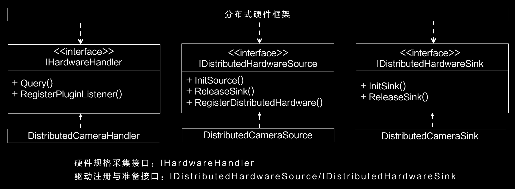 在硬件規(guī)格采集接口中,直接定義了規(guī)格信息的采集以及外設熱插拔事件監(jiān)聽等功能;由于我們是跨設備硬件調(diào)用,涉及雙端設備的硬件,因此我們定義使用周邊其他設備硬件外設的一端為Source端,共享本地硬件給其他設備調(diào)用的一端為Sink端,驅動注冊與準備接口包括Source和Sink兩端。