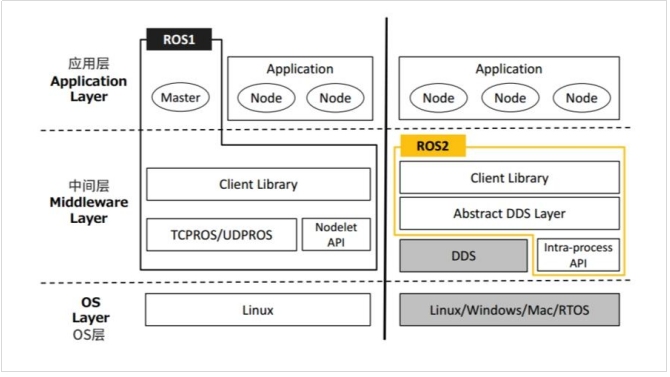 ROS2和ROS1的系統(tǒng)架構(gòu)框圖對比 由下往上看,在操作系統(tǒng)層,ROS2比ROS1支持的底層操作系統(tǒng)更多,也支持實(shí)時操作系統(tǒng)(RTOS)了。這就讓ROS2可以支持更多樣化的嵌入式硬件,例如機(jī)器人應(yīng)用中一些輕量化的ECU。在中間層,ROS1更多地依賴TCP和UDP協(xié)議,而在ROS2中則引入了DDS。DDS全稱是Data Distribution Service 數(shù)據(jù)分發(fā)服務(wù),是一種分布式實(shí)時通信中間件協(xié)議,也是一個被很多公司實(shí)現(xiàn)的工業(yè)標(biāo)準(zhǔn)。DDS采用發(fā)布/訂閱體系架構(gòu),強(qiáng)調(diào)以數(shù)據(jù)為中心,提供豐富的服務(wù)質(zhì)量(QoS)策略,以保障數(shù)據(jù)進(jìn)行實(shí)時、高效、靈活地分發(fā)。正是基于DDS的通訊機(jī)制,ROS的應(yīng)用層就不再需要Master節(jié)點(diǎn)。節(jié)點(diǎn)之間采用自發(fā)現(xiàn)機(jī)制,找到彼此,進(jìn)而建立穩(wěn)定的通信連接。這對于滿足功能安全需求,有很大幫助。當(dāng)然,ROS1和ROS2的應(yīng)用層軟件接口是匹配的,讓ROS1上開發(fā)的應(yīng)用軟件能快速復(fù)用部署到ROS2上,也是ROS2的設(shè)計目標(biāo)。