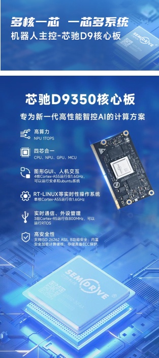 在當(dāng)今數(shù)字化時代,嵌入式系統(tǒng)得到快速發(fā)展,機(jī)器人、人工智能、ChatGPT的頻率越來越高,工業(yè)智能系統(tǒng)對基于智能芯片上的處理能力和處理速度的需求更為強(qiáng)勁。傳統(tǒng)基于CPU的處理器已經(jīng)不能滿足各項智能任務(wù)的要求,智能控制SoC芯片的橫空出世,已經(jīng)成為眾多智能終端設(shè)備的首選,智能控制SoC芯片的多核異構(gòu)結(jié)構(gòu)能夠配合人工智能算法進(jìn)行深度耦合,獲取更高效能和更復(fù)雜算法的支持,為智能AI、人工智能、機(jī)器人的應(yīng)用夯實(shí)了基礎(chǔ)。而芯馳D9350這款國產(chǎn)多核異構(gòu)SoC,正適合應(yīng)用到機(jī)器人場景,米爾作為嵌入式處理器模組廠商,也推出了基于芯馳D9350的核心板和開發(fā)板,助力開發(fā)者賦能智能機(jī)器人應(yīng)用。