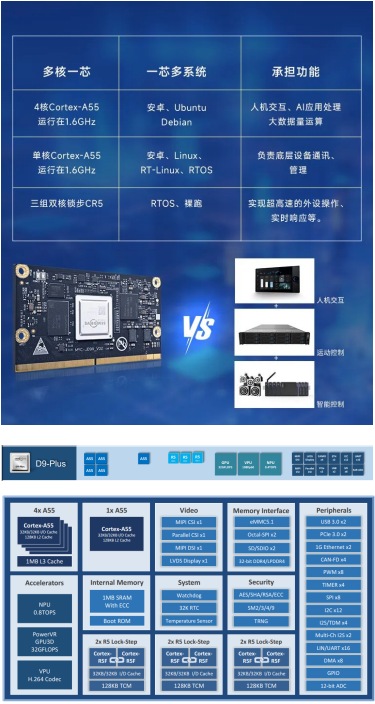 機(jī)器人主控方案需要更強(qiáng)大和全面的性能,一般采用Android+Linux+ros系統(tǒng)的操作,需要3顆獨(dú)立的芯片支撐整個操作系統(tǒng),存在兼容難度大、成本較高等問題。而芯馳D9350擁有高集成度、高算力、高效率、高處理能力、高接入能力以及高安全等六大產(chǎn)品制高點(diǎn),實(shí)現(xiàn)了CPU、NPU、GPU、MCU“四芯合一”,且配備5*Cortex-A55內(nèi)核,支持RT-LINUX+安卓和ubuntu系統(tǒng)+RTOS系統(tǒng)等多個操作系統(tǒng)并行,真正實(shí)現(xiàn)“多核一芯、一芯多系統(tǒng)”,芯馳D9350以其高集成度提升系統(tǒng)性價比,降低部署難度。