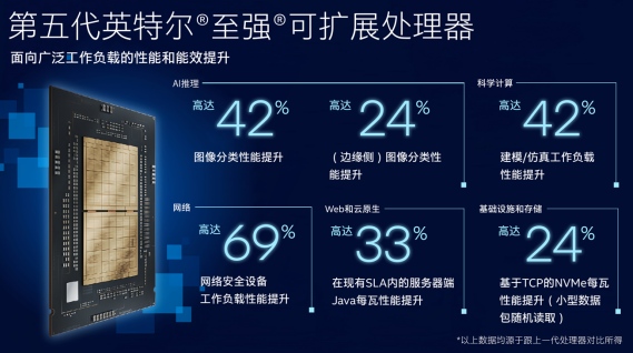 第五代英特爾® 至強(qiáng)® 可擴(kuò)展處理器在提高人工智能、科學(xué)計(jì)算、網(wǎng)絡(luò)、存儲(chǔ)、數(shù)據(jù)庫(kù)、安全等關(guān)鍵工作負(fù)載的每瓦性能①,以及降低總體擁有成本(TCO)方面有出色表現(xiàn)。② 本次是英特爾至強(qiáng)可擴(kuò)展處理器系列產(chǎn)品在一年內(nèi)進(jìn)行的第二次發(fā)布,相較于上一代產(chǎn)品,第五代英特爾® 至強(qiáng)® 可擴(kuò)展處理器可在相同熱設(shè)計(jì)功耗 (TDP)范圍內(nèi)提供更高的算力和更快的內(nèi)存。② 同時(shí),該處理器與上一代產(chǎn)品的軟件和平臺(tái)兼容,使客戶(hù)能夠升級(jí)并大幅增加基礎(chǔ)設(shè)施的使用壽命,同時(shí)降低成本和碳排放。