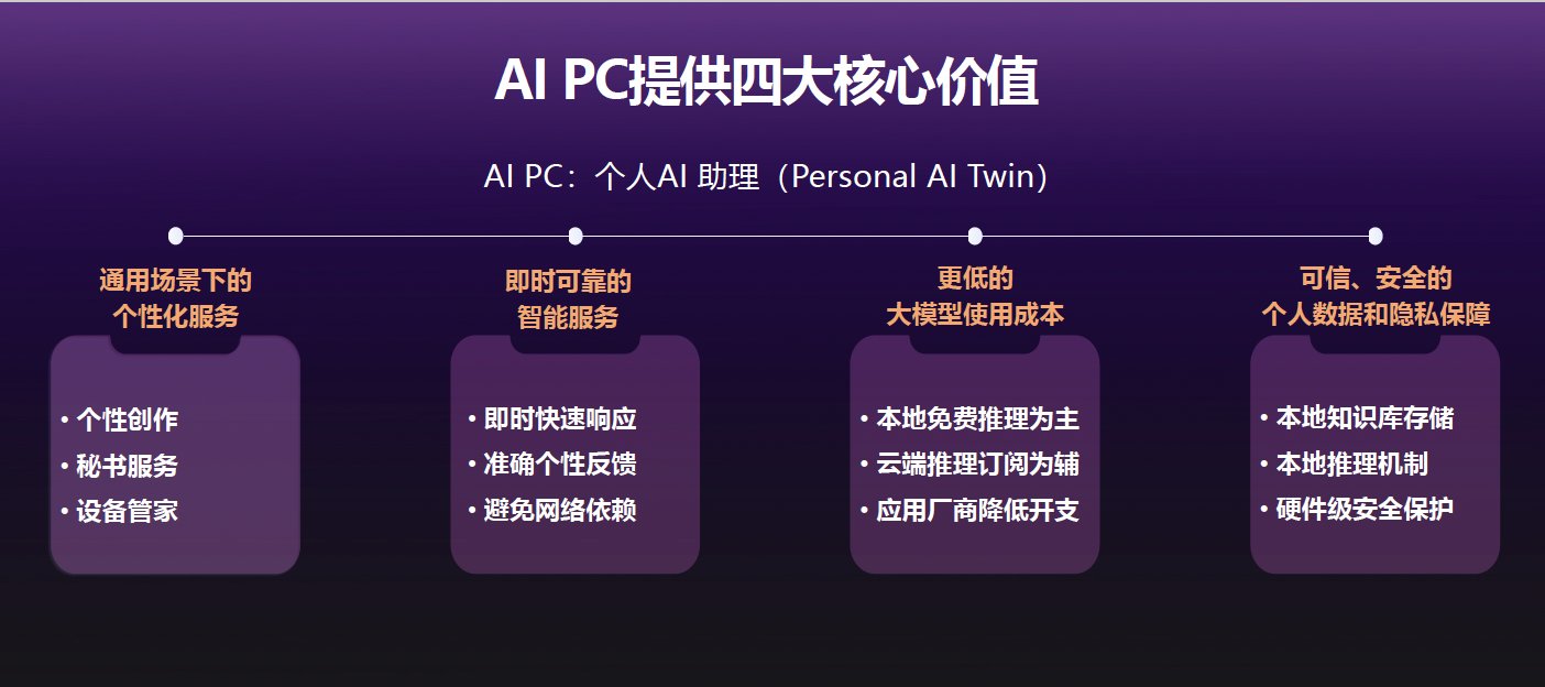 AI On則是指PC具有完整的AI PC核心特征,并且在在廣泛的通用場景提供劃時代的AI創(chuàng)新體驗,成為每一個人的個人AI助理。隨著核心技術(shù)創(chuàng)新、產(chǎn)品體驗優(yōu)化、AI應(yīng)用生態(tài)繁榮,AI PC能夠服務(wù)于更加廣泛的通用場景,并且能夠?qū)崿F(xiàn)端邊協(xié)同計算、跨設(shè)備互聯(lián)接力,甚至能夠基于個人數(shù)據(jù)和使用歷史,在邊緣私域環(huán)境下實現(xiàn)個人大模型的微調(diào)訓(xùn)練。