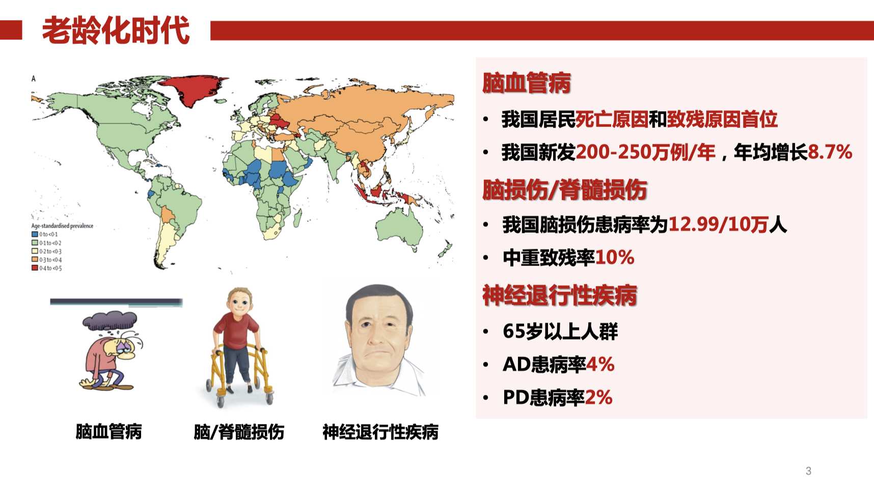 全球正面臨著嚴峻的人口老齡化問題,伴隨而來的是與老齡化密切相關的神經退行性疾病,如帕金森病,以及各種腦損傷(包括腦出血、腦梗塞、腦外傷等)。隨著老齡化程度的增加,老年人跌倒的風險逐漸升高,從而導致腦外傷發(fā)病率的增加。這些疾病常常導致患者在運動、感覺、言語和認知等方面出現(xiàn)功能障礙,嚴重影響他們的日常生活能力。