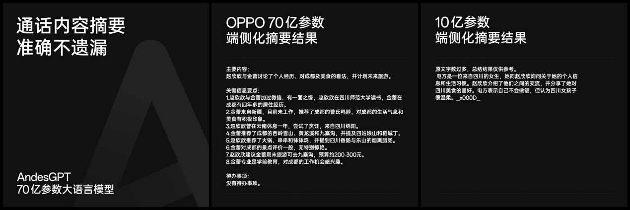 同時,OPPO的AndesGPT可以實現(xiàn)最高14,000的摘要字數(shù)上限,達到了同平臺其他模型的3.5倍。在生成質(zhì)量方面,相比于10億參數(shù)模型,AndesGPT 70億參數(shù)大語言模型以更高“智商”的理解能力,為通話摘要能力上帶來更完整、更準確的記錄。