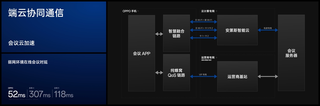 OPPO獨有的智慧通信技術(shù)利用安第斯智能云提供的智能計算服務,行業(yè)領(lǐng)先的智慧融合鏈路技術(shù),并結(jié)合跨層數(shù)據(jù)加速能力,實現(xiàn)Wi-Fi和蜂窩多網(wǎng)絡組合的加速策略。此外,基于通信QoS鏈路技術(shù),OPPO通過三大運營商5G精品專網(wǎng)的建立,實現(xiàn)對會議數(shù)據(jù)進行加速,改善會議時延。