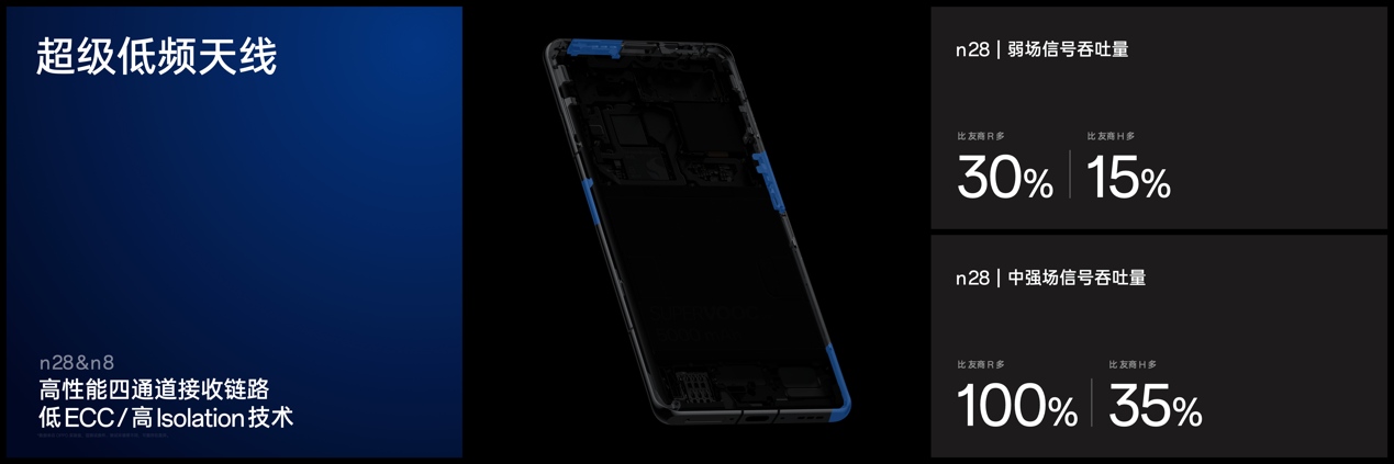 OPPO通過天線小型化技術(shù)和低頻四天線的空間分布優(yōu)化,為下一代旗艦產(chǎn)品帶來最高性能的四天線架構(gòu)。通過結(jié)合低ECC和高隔離度技術(shù),OPPO可以進一步提升超級低頻四天線的吞吐量并降低網(wǎng)絡延遲。面向握持對信號強度的影響,OPPO對低頻天線進行了特殊設計,構(gòu)建了OPPO自研手持狀態(tài)下的信號模型,改善手持狀態(tài)下的手機信號狀況,實現(xiàn)了最高7dB,平均3dB的信號強度提升。
