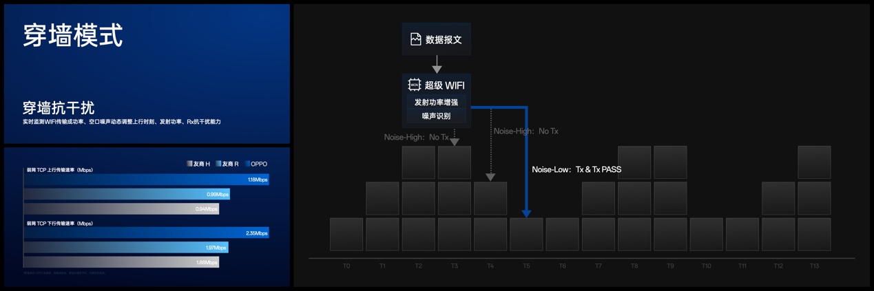 超級信號工程還將為FindX7帶來全新的近場通信體驗。利用近場通信的穿墻模式,F(xiàn)ind X7通過主動噪聲識別,動態(tài)選擇最優(yōu)的發(fā)送和接收時隙,提升抗干擾能力,并結(jié)合射頻增強技術(shù),實現(xiàn)上行和下行速率的提升。通過高吞吐模式,F(xiàn)indX7 系列可以利用全新的160Mhz帶寬進行手機搬家的傳輸,在不到15分鐘的時間就可以完成180GB內(nèi)容的搬運。利用雙天線防丟包技術(shù),F(xiàn)ind X7 系列也可以帶來更低的Wi-Fi網(wǎng)絡時延。利用Wi-Fi & 藍牙全加速 3.0技術(shù),F(xiàn)indX7系列能夠解決傳統(tǒng)方案中Wi-Fi和藍牙的數(shù)據(jù)傳輸影響。相比其他產(chǎn)品,這一技術(shù)幫助Find X7 系列降低接近150ms的游戲延遲以及18次的直播卡頓。
