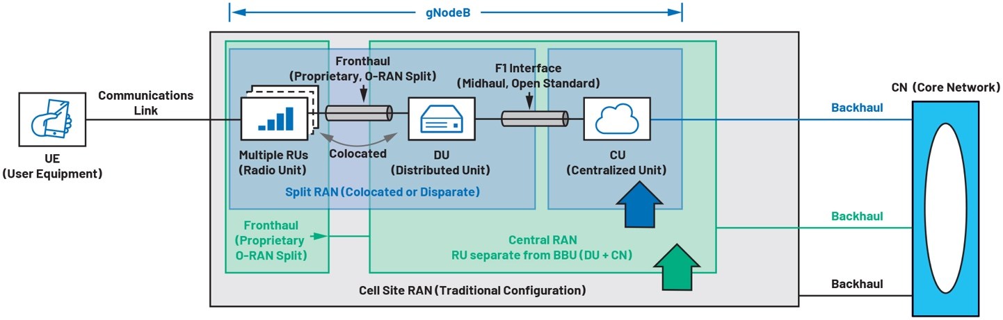 ?蜂窩站點RAN:傳統(tǒng)配置,射頻單元(RU)和BBU功能位于蜂窩站點。單獨的回傳鏈路連接到核心網(wǎng)絡。