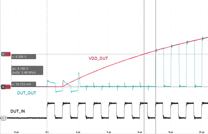 市場(chǎng)上大多數(shù)柵極驅(qū)動(dòng)IC的UVLO啟動(dòng)時(shí)間為5μs或更長(zhǎng)。全新EiceDRIVERTM 2EDN柵極驅(qū)動(dòng)IC的UVLO啟動(dòng)時(shí)間(tSTART)為1.8μs(典型值),因此,在解除UVLO時(shí)僅丟失最少數(shù)量PWM脈沖,從而實(shí)現(xiàn)安全的轉(zhuǎn)換器啟動(dòng)和可靠運(yùn)行。圖7所示為UVLO恢復(fù)過(guò)程中的tSTART實(shí)測(cè)數(shù)據(jù)。
