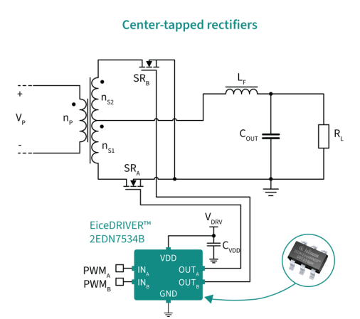 除提供多個(gè)封裝選項(xiàng)之外,新的EiceDRIVERTM 2EDN產(chǎn)品系列還具備一個(gè)經(jīng)優(yōu)化的輸出級(jí),可實(shí)現(xiàn)驅(qū)動(dòng)電壓有源箝位、更短欠壓鎖定(UVLO)啟動(dòng)時(shí)間和更低電流消耗。不僅如此,高精度傳播延遲允許兩路并行輸出,可將電流能力提高至兩倍,并最大限度地減少死區(qū)時(shí)間損耗,從而達(dá)到很高系統(tǒng)效率。圖2(右圖)顯示了一個(gè)通過(guò)實(shí)現(xiàn)兩路并行輸出獲益匪淺的應(yīng)用示例:混合開(kāi)關(guān)電容轉(zhuǎn)換器(HSC)中的同步整流級(jí)通常在沒(méi)有柵極電阻器的情況下運(yùn)行,以實(shí)現(xiàn)最快開(kāi)關(guān)瞬態(tài)。使用EiceDRIVERTM 2EDNxx3x產(chǎn)品的另一個(gè)應(yīng)用示例是服務(wù)器SMPS中典型的中心抽頭整流器,如圖2所示。全新EiceDRIVERTM 2EDN7534B采用SOT23封裝,其性能與其他采用行業(yè)標(biāo)準(zhǔn)封裝(DSO和TSSOP)的產(chǎn)品一樣,但占用的PCB面積更小,這一點(diǎn)在空間受限的設(shè)計(jì)中尤為重要。
