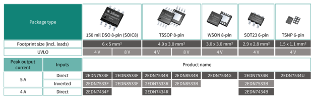 EiceDRIVERTM 2EDNxx3x產(chǎn)品系列可提供5種不同封裝:3種工業(yè)級(jí)標(biāo)準(zhǔn)的8引腳封裝DSO (SOIC)、TSSOP和WSON,以及專(zhuān)為超高功率密度應(yīng)用設(shè)計(jì)的小型6引腳封裝SOT23和TSNP。每種封裝類(lèi)型都可提供不同的峰值電流能力、正向輸入和反向輸入以及專(zhuān)門(mén)的欠壓鎖定電平,以滿(mǎn)足不同目標(biāo)應(yīng)用的要求。表1概括列出了可提供的產(chǎn)品和特性。
