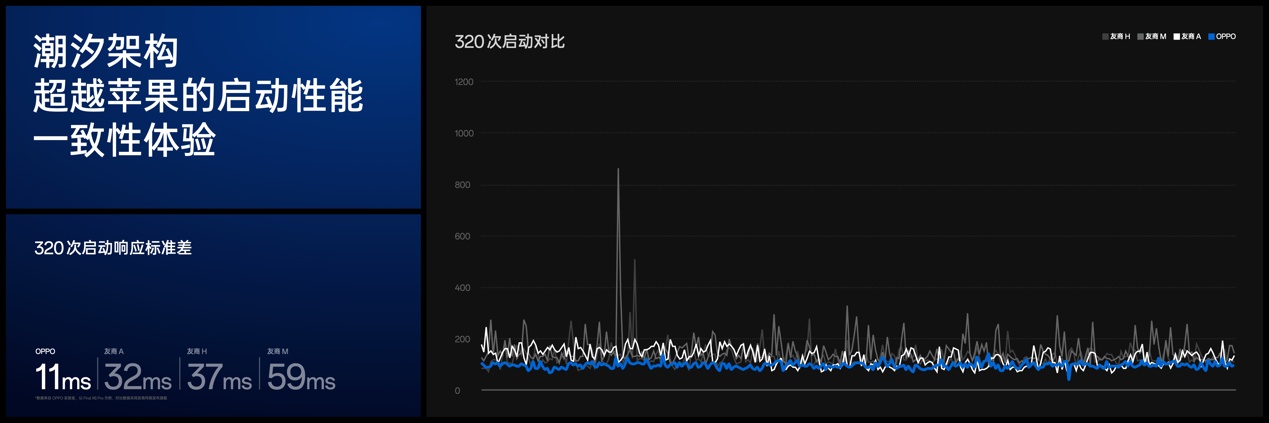 此外,潮汐架構(gòu)還支持全新的芯片內(nèi)場(chǎng)景級(jí)算力、功耗分析模型,能夠?qū)崿F(xiàn)基于單場(chǎng)景的動(dòng)態(tài)算力與功耗評(píng)估和分析,以及實(shí)時(shí)動(dòng)態(tài)地將每一個(gè)計(jì)算任務(wù)拆解到芯片上各個(gè)計(jì)算單元的算力分布,找出做到最佳能效組合,為多樣性的用戶應(yīng)用都實(shí)現(xiàn)更具競(jìng)爭(zhēng)力的能效表現(xiàn)。通過精準(zhǔn)地動(dòng)態(tài)調(diào)度GPU的算力,潮汐架構(gòu)還可以出色地控制顯示時(shí)延,為 FindX7 實(shí)現(xiàn)前所未有的持續(xù)流暢體驗(yàn)。在模擬用戶一天320次啟動(dòng)應(yīng)用的測(cè)試中,搭載潮汐架構(gòu)的Find X7 標(biāo)準(zhǔn)差只有11ms,實(shí)現(xiàn)了比同平臺(tái)和其他平臺(tái)都持久穩(wěn)定的流暢表現(xiàn)。