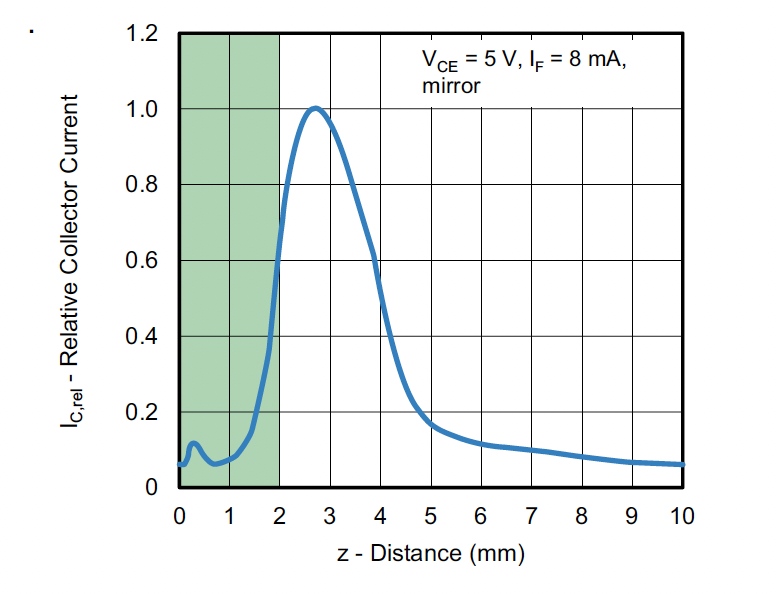 圖2:距離曲線表示傳感器相對(duì)輸出信號(hào)與透鏡或鏡片距離的關(guān)系。(圖片來(lái)源:Vishay Intertechnology)