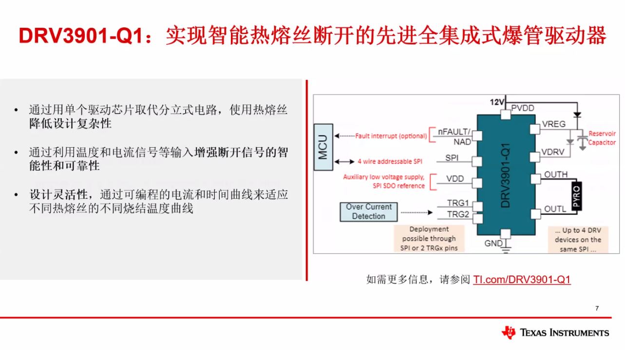 DRV3901-Q1就是這樣一款創(chuàng)新的Pyrofuse Driver,其主要特點(diǎn)在于通過單芯片方案驅(qū)動封閉式電路,顯著降低了系統(tǒng)的復(fù)雜性。這與市場上常見的兩種Pyrofuse驅(qū)動方案——復(fù)雜的離散芯片方案和舊式解決方案相比,DRV3901-Q1不僅系統(tǒng)復(fù)雜性更低,而且效率更高。它不僅簡化了設(shè)計,還通過集成診斷功能提高了設(shè)計的可靠性。此外,DRV3901-Q1具備溫度和電流信號輸入,增強(qiáng)了斷開信號的智能性和可靠性,同時也支持SPI編程,允許用戶通過軟件設(shè)置電流和時間曲線,以適應(yīng)不同類型的Pyrofuse,從而大幅提高系統(tǒng)設(shè)計的靈活性。這些特點(diǎn)使DRV3901-Q1成為一種高效、可靠且靈活的Pyrofuse驅(qū)動解決方案,優(yōu)化了設(shè)計過程并提升了系統(tǒng)性能。