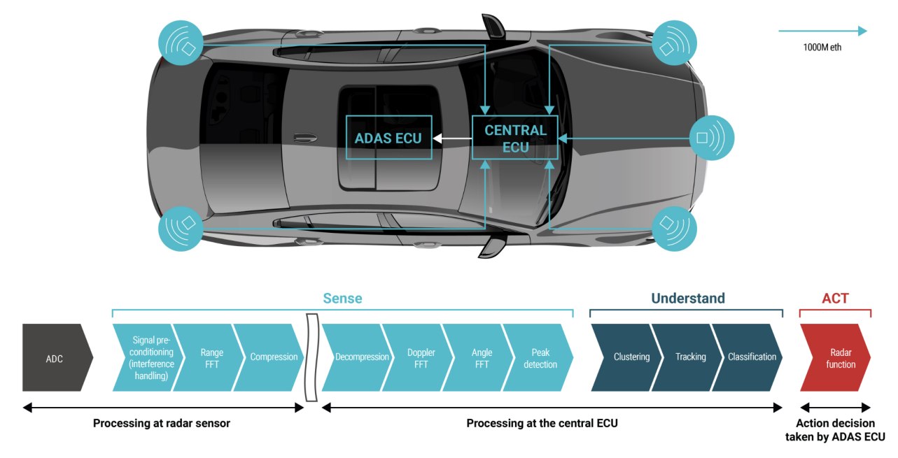 在傳統(tǒng)架構(gòu)中,為了加速整個鏈路的效能,減少ADAS ECU的計算負(fù)擔(dān),雷達(dá)模塊上需要進(jìn)行更多的計算,將計算之后的數(shù)據(jù)再傳輸?shù)紸DAS ECU中進(jìn)行融合。而在衛(wèi)星架構(gòu)中,雷達(dá)模塊中不需要再進(jìn)行高階的計算工作,只需要進(jìn)行一些基本的感知數(shù)據(jù)預(yù)處理,然后就可以通過高速鏈路傳輸至中央ECU,由中央ECU中進(jìn)行多傳感數(shù)據(jù)處理、計算和融合,然后由ADAS來進(jìn)行決策即可。