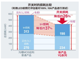 “YQ系列”是繼以往支持各種電路應(yīng)用的4個SBD系列之后推出的新系列產(chǎn)品,也是ROHM首款采用溝槽MOS結(jié)構(gòu)的二極管。該系列利用ROHM自有的結(jié)構(gòu)設(shè)計,實現(xiàn)了業(yè)界超快的trr(15ns),與同樣采用溝槽MOS結(jié)構(gòu)的普通產(chǎn)品相比,trr單項的損耗降低約37%,總開關(guān)損耗降低約26%,因此,有助于降低應(yīng)用產(chǎn)品的功耗。另外,通過采用溝槽MOS結(jié)構(gòu),與以往采用平面結(jié)構(gòu)的SBD相比,正向施加時的損耗VF*2和反向施加時的損耗IR*3均得到改善。這不僅可以降低在整流應(yīng)用等正向使用時的功率損耗,還可以降低對于SBD而言最令人擔(dān)心的熱失控風(fēng)險*4。這些優(yōu)勢使得該系列產(chǎn)品非常適用于容易發(fā)熱的車載LED前照燈的驅(qū)動電路、xEV用的DC-DC轉(zhuǎn)換器等需要進(jìn)行高速開關(guān)的應(yīng)用。