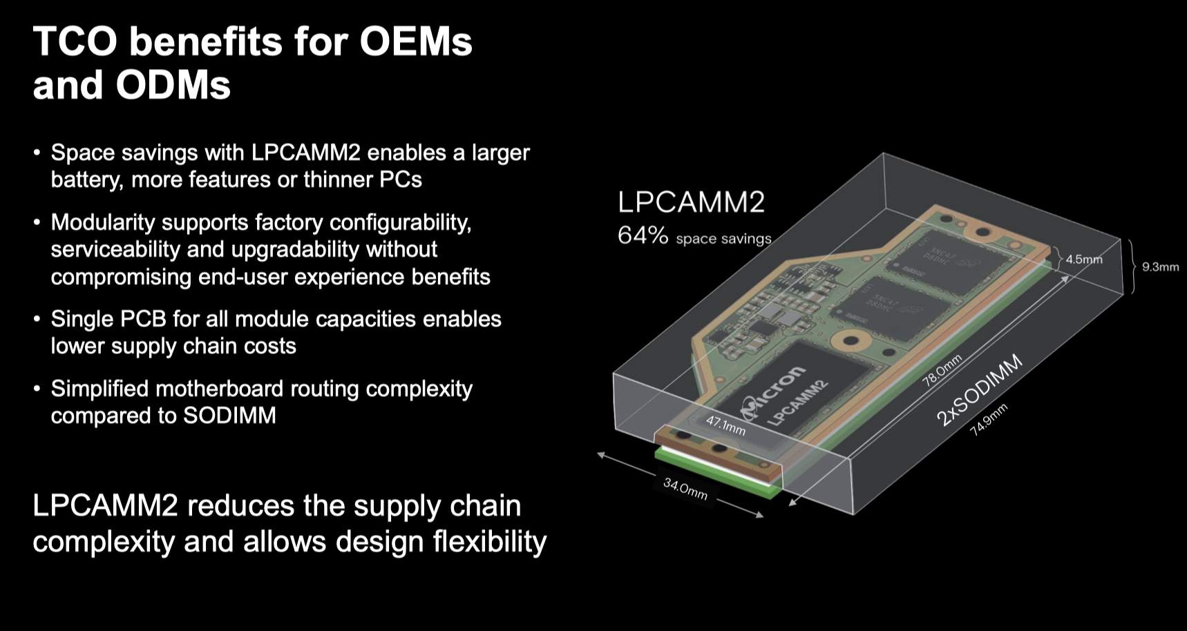 LPCAMM2是JEDEC版本的業(yè)界標(biāo)準(zhǔn),是美光與JEDEC、合作伙伴共同設(shè)計(jì)開發(fā)外形規(guī)格,其中包含陣腳規(guī)格、PCB尺寸、在PCB上的電源管理IC等。要在PC或筆記本上搭載LPCAMM2,則意味著主板需要進(jìn)行重新設(shè)計(jì),這是比心需要極大的市場動(dòng)能。而這種市場動(dòng)能,來自LPCAMM2能夠給予用戶和OEM的更多價(jià)值。