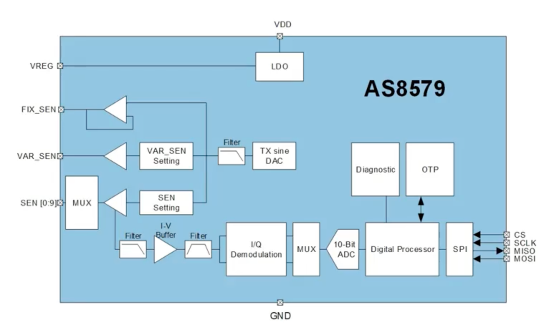 AS8579的卓越特點(diǎn)在于其具有高靈敏度和14bit分辨率,測量范圍從20到2000pF。而且能通過DC偏置調(diào)整以補(bǔ)償溫度變化,有效克服溫度影響,確保測量的穩(wěn)定性。