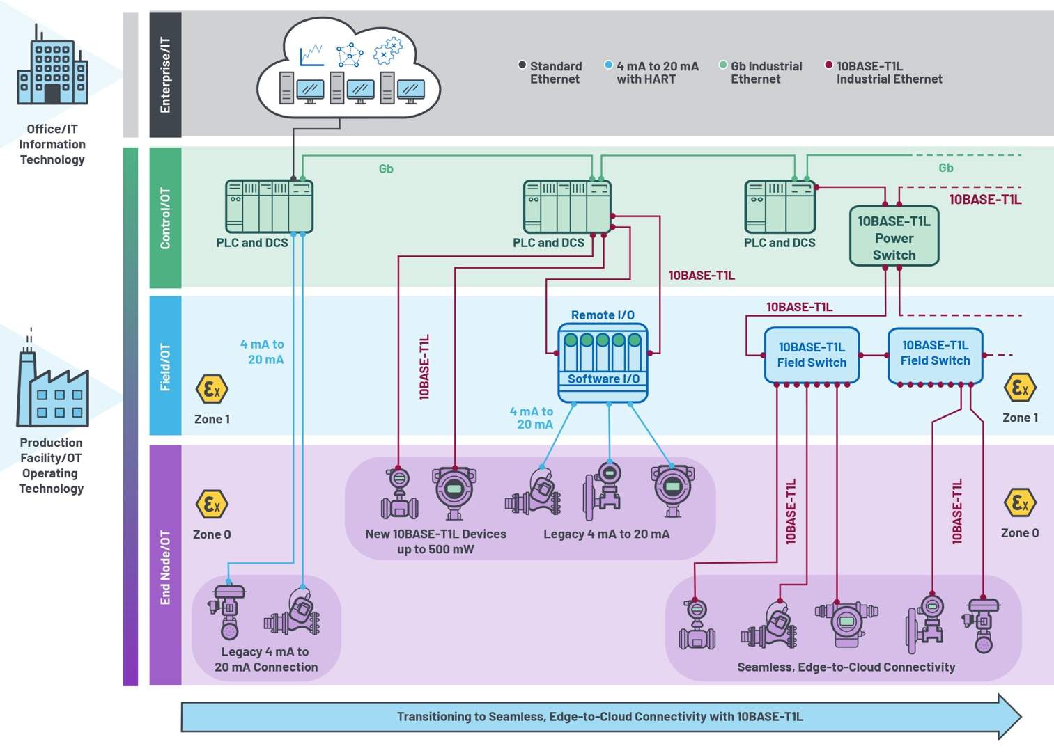 場開關(guān)可通過環(huán)型拓撲連接以實現(xiàn)冗余。在邊緣,對于數(shù)據(jù)速率以前限制為不到30 kbps的大多數(shù)應(yīng)用,高達10 Mbps是一大進步。由于以太網(wǎng)現(xiàn)在用于在現(xiàn)場連接終端節(jié)點器件,IT和OT已成功融合到無縫以太網(wǎng)網(wǎng)絡(luò)上,從而能夠從世界上的任何地方對任何終端節(jié)點器件進行IP尋址。