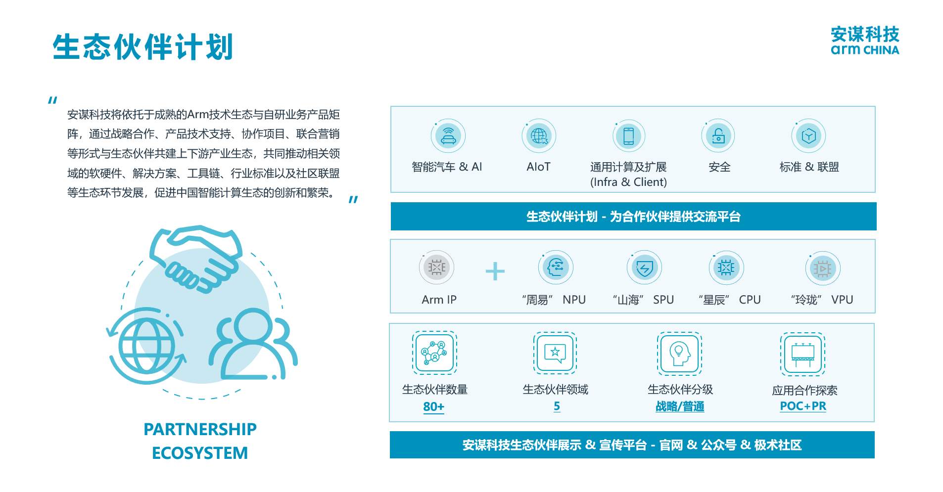 在生態(tài)建設(shè)方面,我們推出了生態(tài)伙伴計(jì)劃、“周易”NPU軟件開源計(jì)劃及相應(yīng)的生態(tài)合作舉措?,F(xiàn)已有80多家頭部企業(yè)加入生態(tài)伙伴計(jì)劃,開展PoC開發(fā)板、線下研討會(huì)、產(chǎn)業(yè)趨勢(shì)報(bào)告、生態(tài)營(yíng)銷推廣等多維合作。值得一提的是,近期安謀科技“周易”NPU系列IP與百度飛槳已完成II級(jí)兼容性測(cè)試,這是安謀科技加入“硬件生態(tài)共創(chuàng)計(jì)劃”后的階段性成果。
