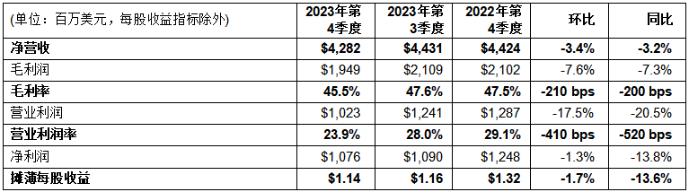 ?第四季度凈營收42.8億美元;毛利率45.5%;營業(yè)利潤率23.9%;凈利潤10.8億美元