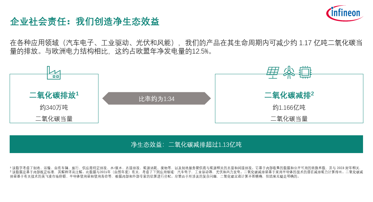 我們正向著公司制定的碳中和目標全速邁進:到2023財年末,盡管業(yè)務增長了約一倍,但公司的碳排放量與2019年的基準相比減少了 56.8%。并且英飛凌產品和解決方案在使用過程中實現的二氧化碳減排量相當于生產過程中二氧化碳排放量的34倍。