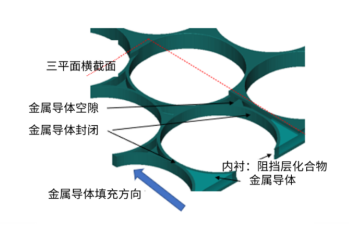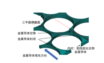 圖2:SEMulator3D 虛擬模型展示了字線邊緣的三平面橫截面圖。金屬導(dǎo)體填充沒有從狹縫溝槽邊緣的封閉處持續(xù)到字線中心。電流僅通過內(nèi)襯,從字線中心傳導(dǎo)到封閉處。