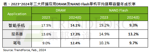 首先從智能手機(jī)來看,由于手機(jī)芯片商主要著眼于運(yùn)算效能的提升,尚無實(shí)際AI應(yīng)用推出,故話題發(fā)酵程度有限。同時(shí),2023年存儲(chǔ)器價(jià)格因市場供過于求而快速崩跌,在價(jià)格來到相對低檔的吸引力,推升2023年DRAM于智能手機(jī)單機(jī)平均搭載容量年增17.5%,而NAND Flash單機(jī)平均搭載容量年增達(dá)19.2%,容量已能滿足使用者需求。因此,2024年在尚未有新應(yīng)用推出的預(yù)期下,不論DRAM或NAND Flash于智能手機(jī)的單機(jī)平均搭載容量的年成長幅度將放緩,分別預(yù)估為11%及9.3%。