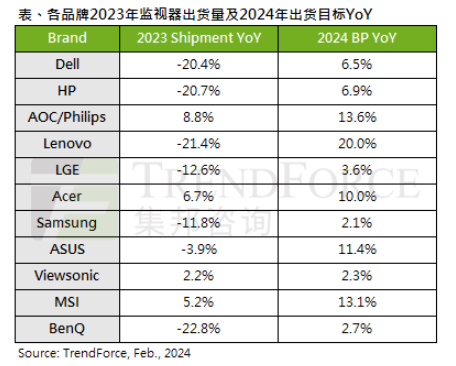 TrendForce集邦咨詢表示,以2024年監(jiān)視器品牌出貨計劃來看,商務(wù)及消費性品牌的出貨目標仍算保守,商務(wù)型以聯(lián)想最積極,年度出貨量成長目標約20%;消費品牌AOC/Philips、微星(MSI)、華碩(ASUS)及宏碁,年度出貨量成長目標均逾10%。相反地,三星電子(Samsung Electronics)、樂金電子(LG Electronics)、明碁(BenQ)2024年出貨量則訂定得較為保守,重心將放在獲利及高端產(chǎn)品線。