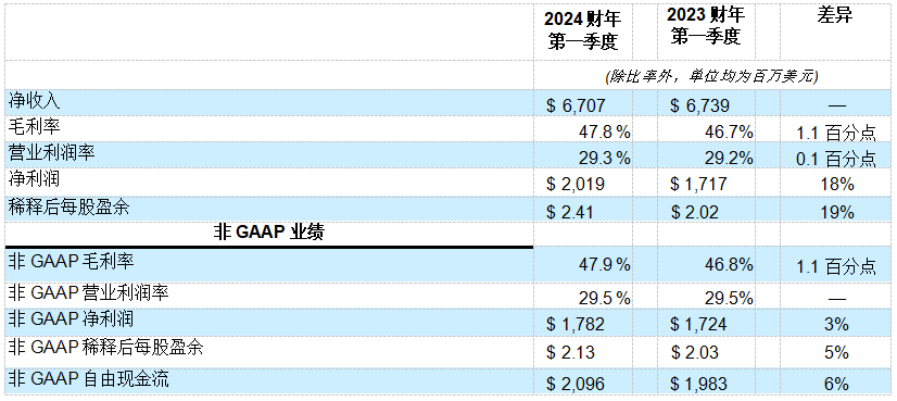 在非GAAP基礎(chǔ)上,公司毛利率為47.9%,營業(yè)利潤為19.8億美元,占凈銷售額的29.5%,每股盈余為2.13美元。