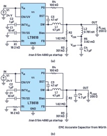 圖3. LTspice測(cè)試電路:(a) 使用4.7 μF電容以及分立的ESL和ESR值;(b) 使用包含ESR和ESL參數(shù)的Würth電容